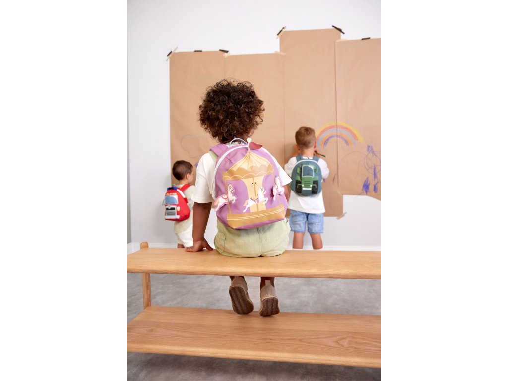 Malý dětský batůžek, kolotoč, je s objemem 3,5 litru nejmenší v řadě LÄSSIG a je vhodný pro děti od 2 let. Veselý design s funkčními prvky z něj dělá věrného společníka. Batůžek má hravé 3D detaily. Kromě designu samozřejmě není opomenuta ani funkčnost. Batohy Tiny nabízejí výškově nastavitelné ramenní popruhy s hrudním popruhem, velkou hlavní přihrádku s přihrádkou na láhev s vodou a samozřejmě jmenovku, aby nedošlo k záměně. Vodoodpudivý vnější materiál zajistí, že vaše oblíbené věci zůstanou suché i v mírném dešti. Materiál je bez PFC.