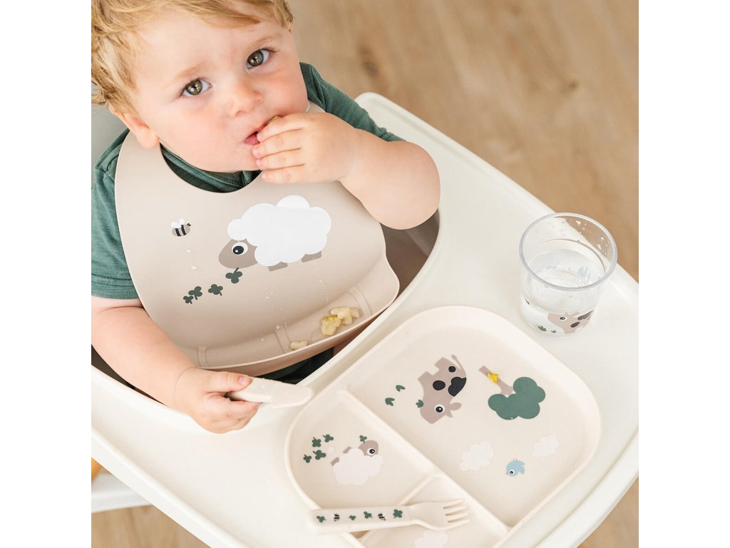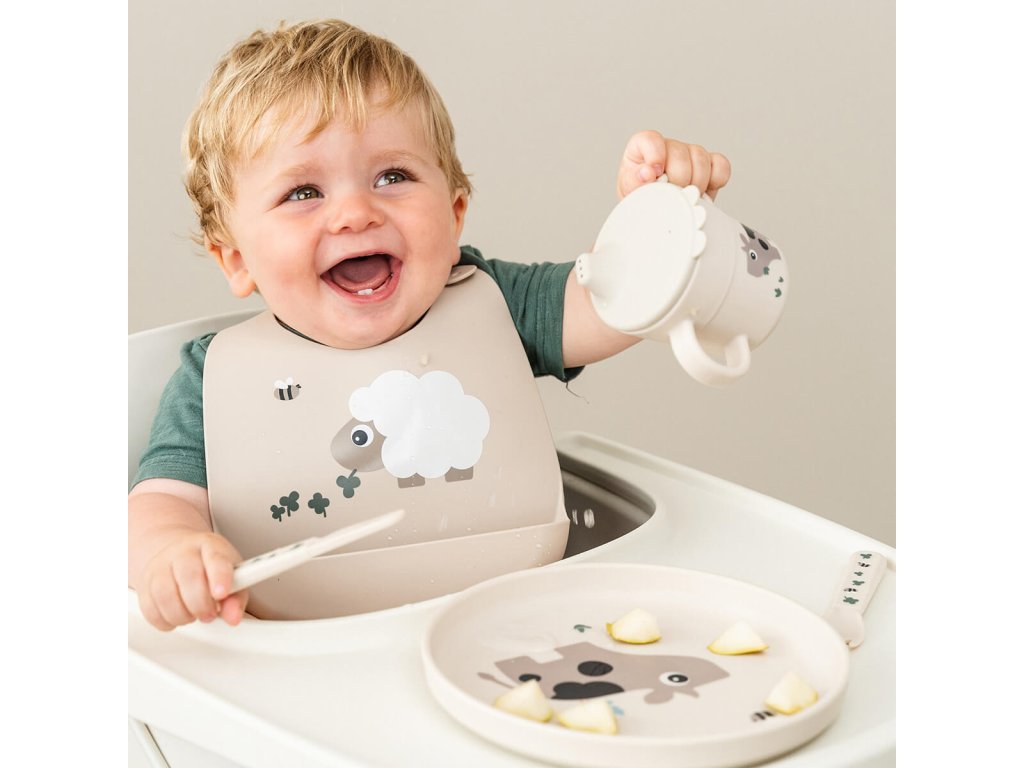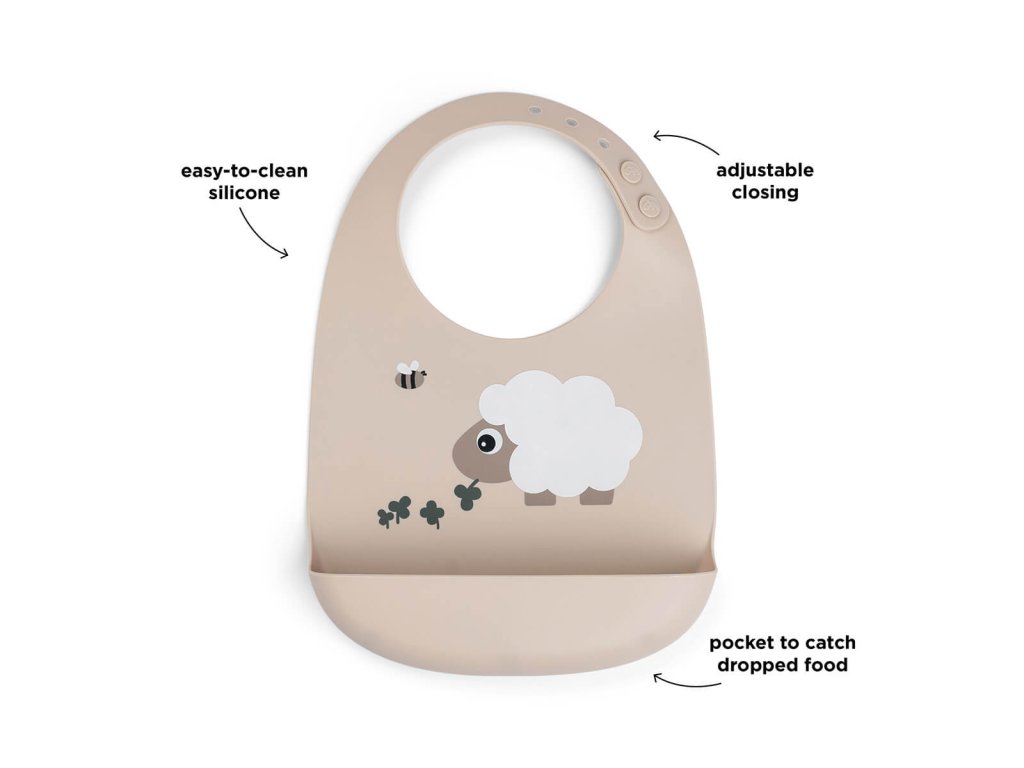 Ovečka Sheepy vykukuje z praktického silikonového bryndáčku - připravený zachytit každý drobeček. Bryndáček je voděodolný, snadno se otírá. Kapsa zachytí padající jídlo a ušetří vám spoustu času při úklidu. Bryndáček je vyroben z potravinářského silikonu. Je měkký a pohodlný na nošení pro nejmenší.