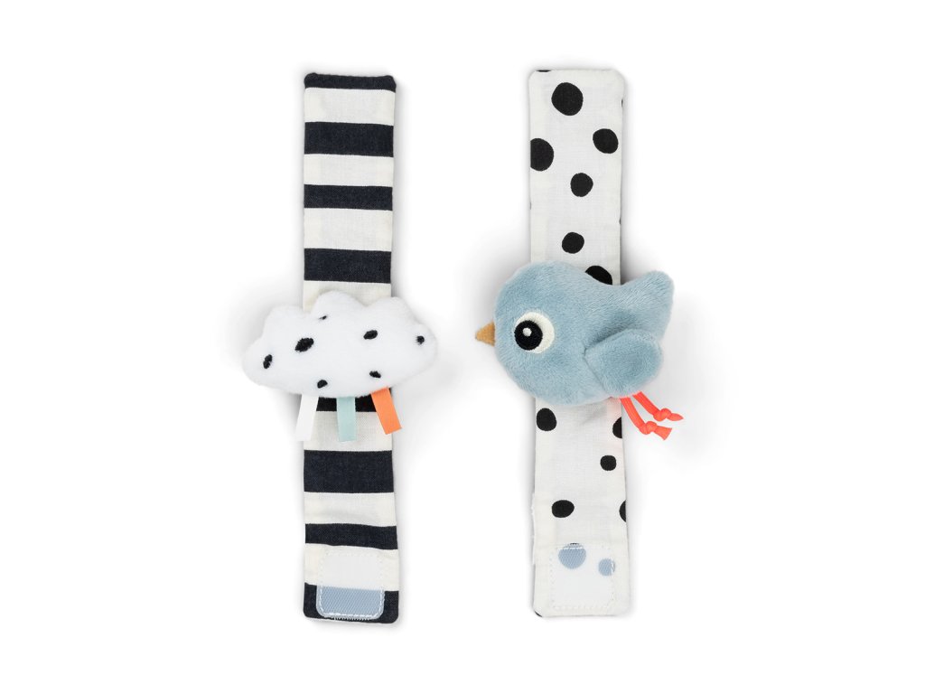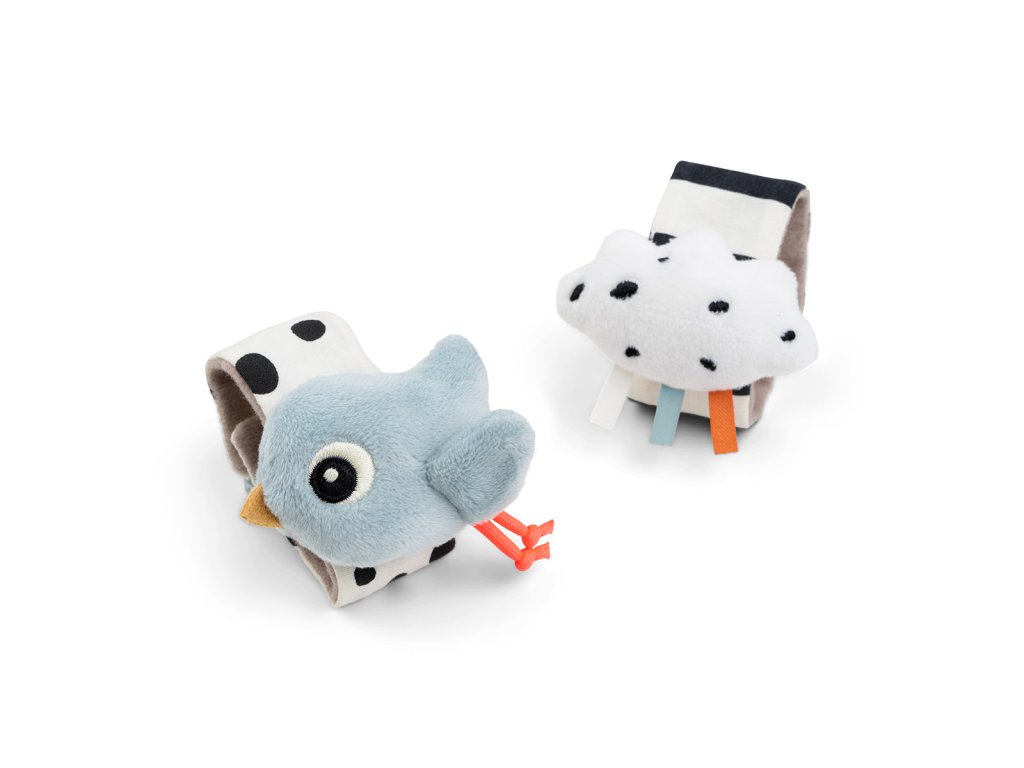 Sada chrastítek na zápěstí Happy clouds se skládá ze 2 měkkých dětských náramků s pudrovými detaily. Doporučeno od 0 měsíců. Ideální pro smyslovou stimulaci, uvědomování si těla a rozpoznávání rukou. Kontrastní tečky a pruhy a barevné prvky pro vizuální stimulaci. Drnčení a vrzání stimulují vaše dítě. Jeden náramek má tečky a Birdee, zatímco druhý má pruhy a obláček. Zapínání na suchý zip usnadňuje nasazování a vyjímání chrastítek. Lze použít jak na zápěstí, tak na kotníky.