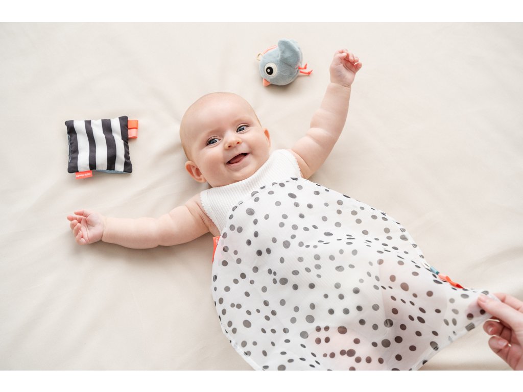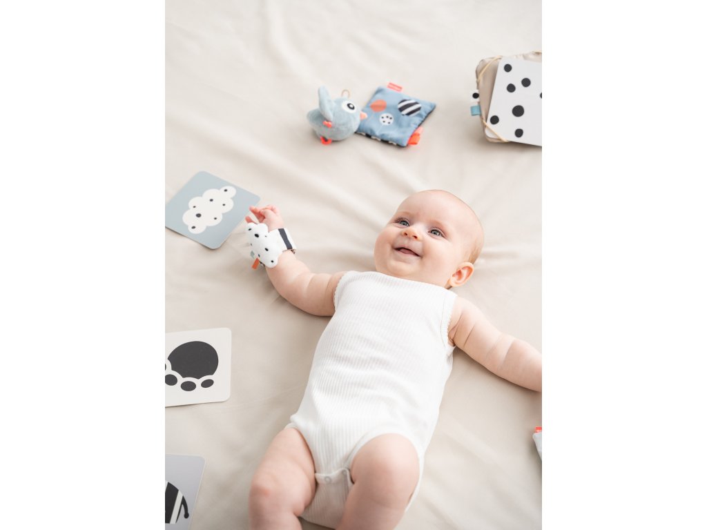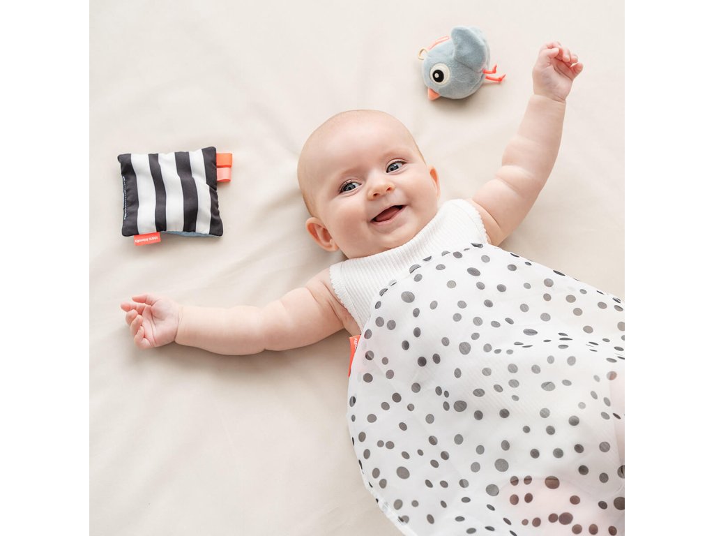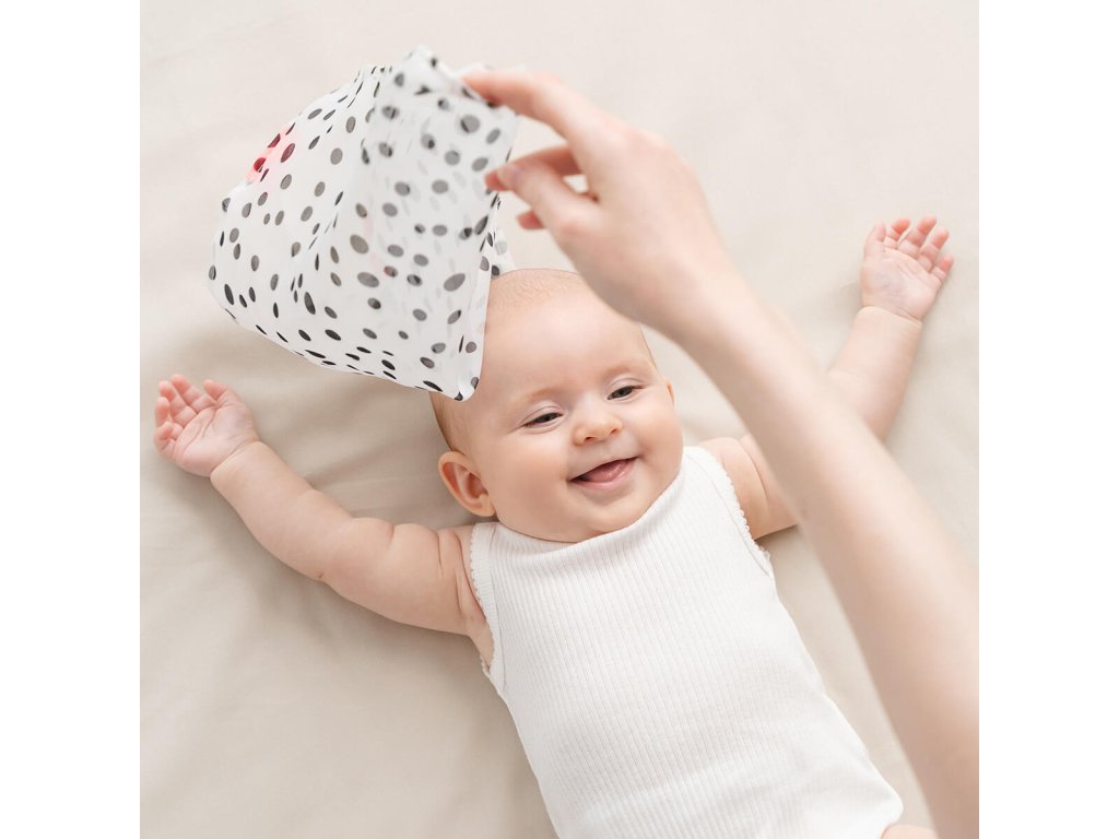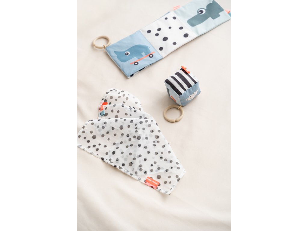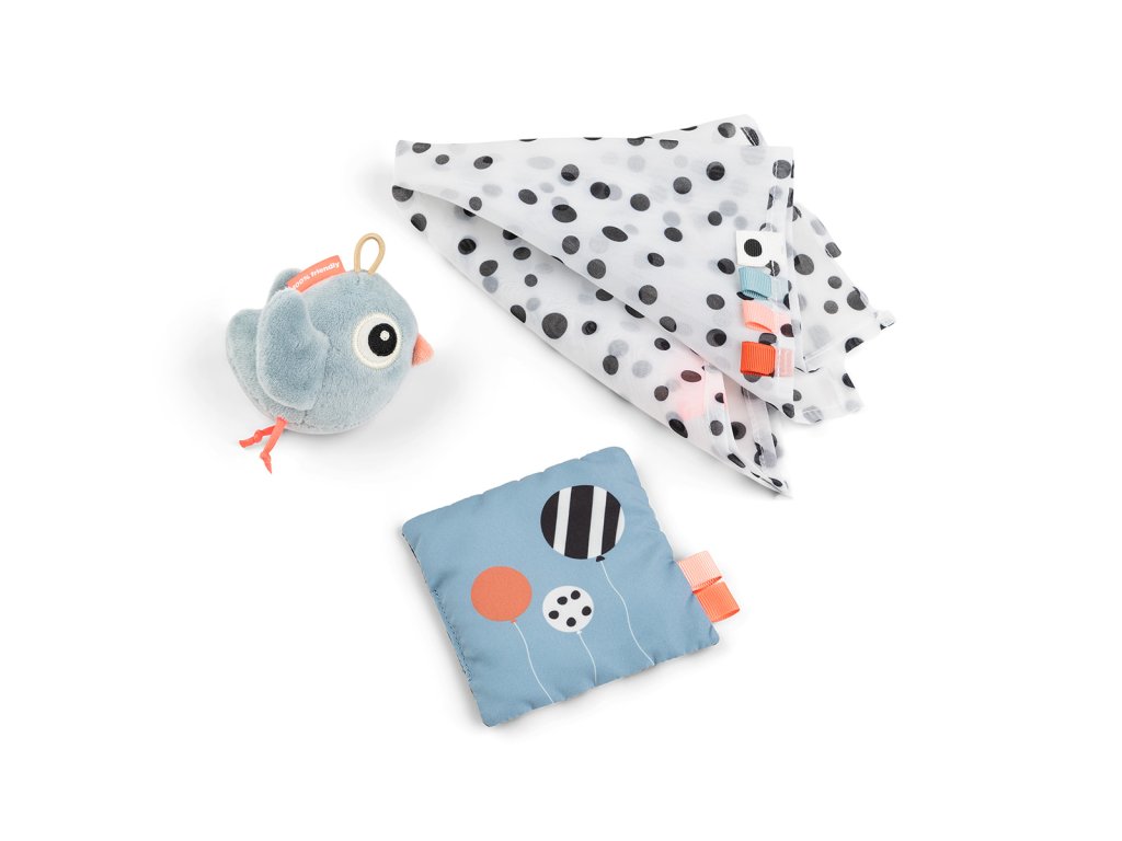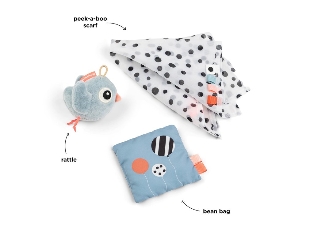 Drobná sada smyslových hraček, s fazolkovým vakem, malým šátkem a roztomilým chrastítkem Birdee. Doporučeno od 0 měsíců. Ideální pro ranou hru a smyslovou stimulaci vašeho děťátka. Váček má vysoce kontrastní vzory, které pomáhají stimulovat zrak a vývoj mozku vašeho dítěte v různých fázích - zábavné balónky na jedné straně a černobílé pruhy na druhé. Později bude vaše dítě rádo házet a chytat vak a zároveň si procvičovat koordinaci rukou a očí. Zábavné modré chrastítko Birdee se zvrásněnými křidélky stimuluje smysly vašeho dítěte.