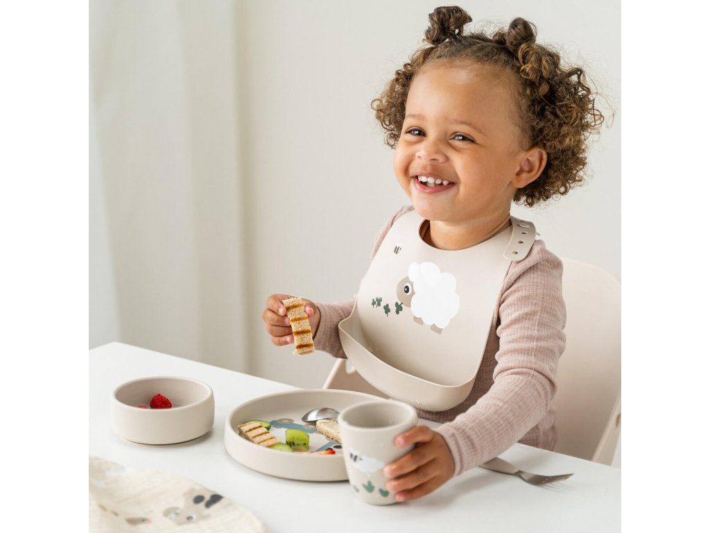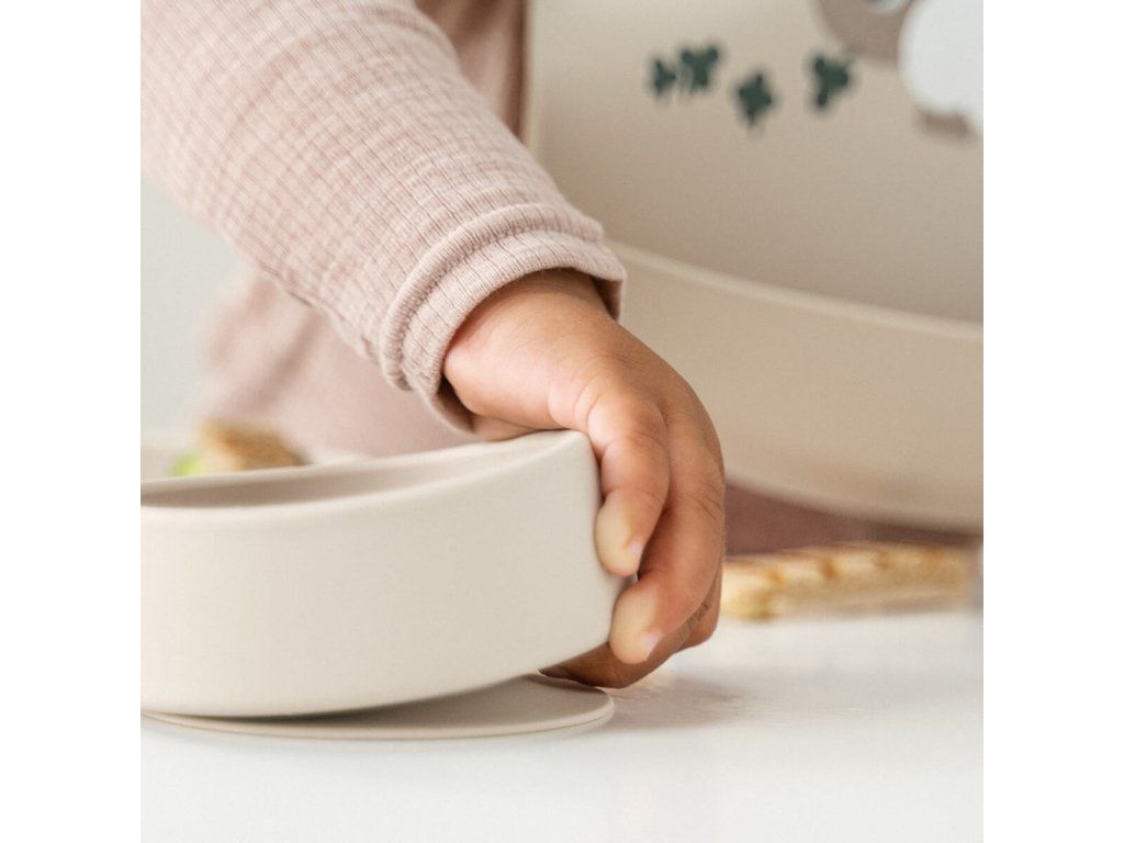 Silikonová jídelní souprava dodá šmrnc každému jídlu. Praktická protiskluzová a snadno uchopitelná silikonová sada obsahuje dětský talíř, misku a mini hrnek. Perfektní první nádobí pro kojence a batolata. Zaoblené vnitřní hrany usnadňují nabírání jídla. Silikon je měkký a odolný, tepelně odolný a vhodný pro použití v mikrovlnné troubě, troubě, mrazáku i myčce. Roztomilá sada je připravená i na tu nejmenší oslavu. Talířek díky silikonové části dobře přilne ke stolu a pomůže ji udržet na jednom místě.