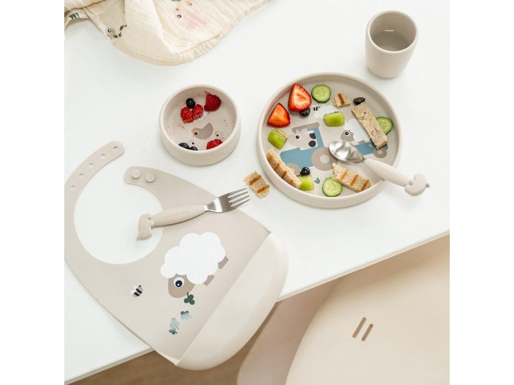 Silikonový jídelní set Stick & Stay Tiny farm - pískový