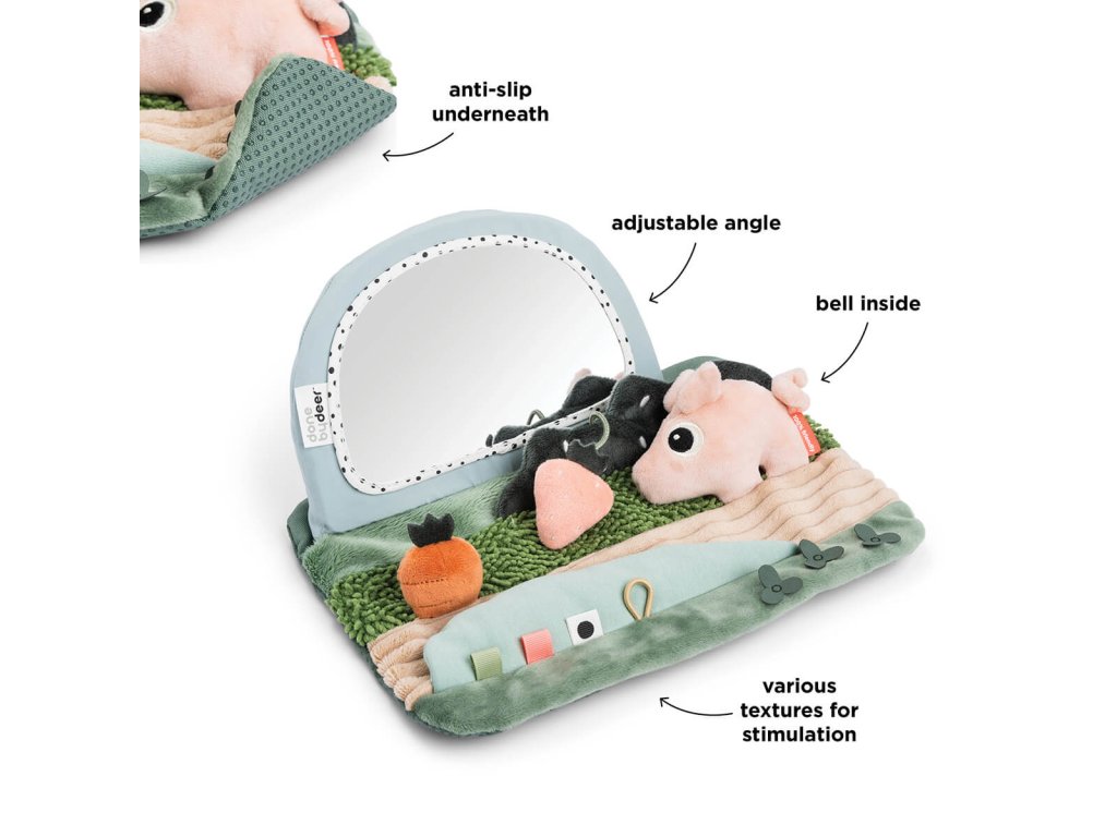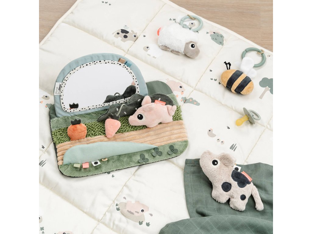 Malé děti baví jejich vlastní odraz, díky kterému je podlahové zrcadlo ideální pro povzbuzení trénování pozice na bříšku. Mnoho senzorických funkcí je povzbudí k delšímu a aktivnějšímu pobytu na břiše. Zrcadlo Tiny farm je navrženo se smyslovými aktivitami, jako jsou barevné štítky, hmatové textury, zvuky - je toho tolik, na co se dívat a zkoumat.