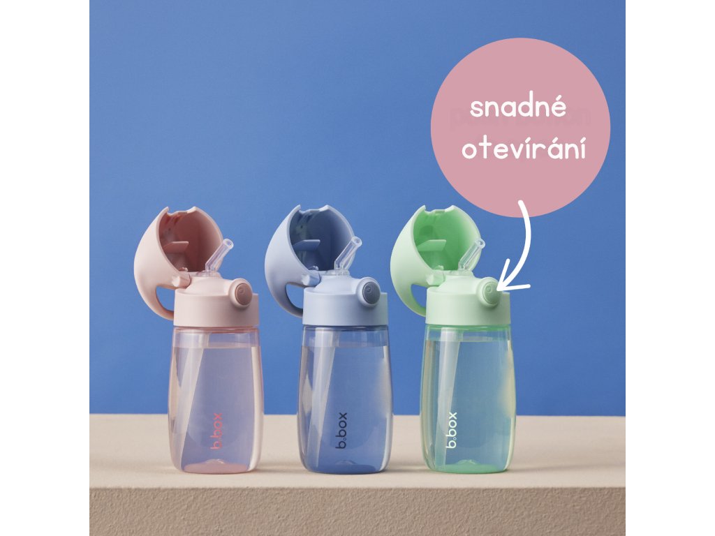 Do školky i do školy, na hřiště i na výlety, tritanovou lahvičku b.box můžete mít všude sebou. S touto lahvičkou děti nemusí sát, stačí jen lehce zmáčknout pítko mezi rty a nápoj teče do úst dítěte sám. Víčko má držátko pro snadné nošení nebo zavěšení na batoh, kočárek apod. Lahvička se po snadném zmáčknutí tlačítka lehce otevře. Lahvička je vyrobena z Tritanu™, je tedy lehká a odolná. Minimum komponentů umožňuje láhev snadno čistit. Láhev má ergonomický tvar pro snadný úchop a odnímatelný dolní kryt.