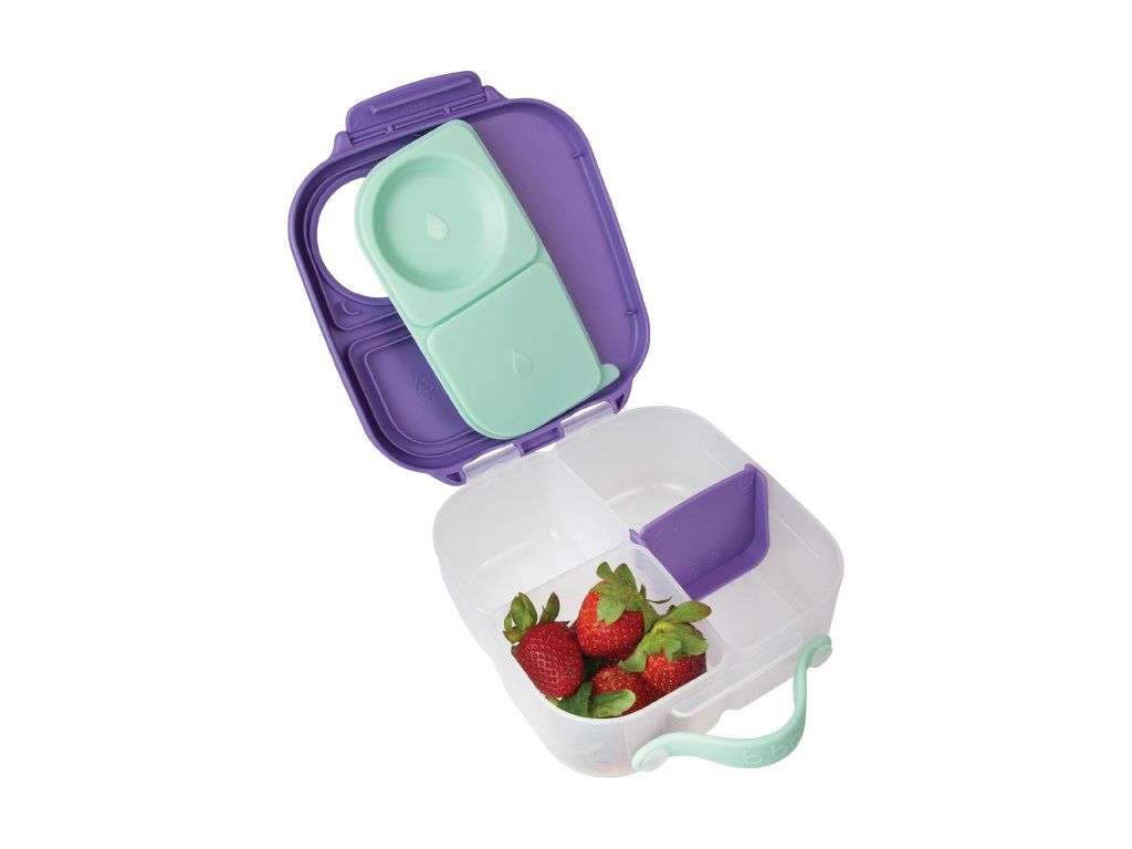 Svačinový box od b.box vám zjednoduší a zpříjemní čas na svačinu nebo přesnídávku. b.box navrhl variabilní lunchbox, do kterého zabalíte nespočet různých druhů svačinek. Najdete zde oddělení pro ovoce, zeleninu, nebo na čtvrtky nakrájený toast. Naprosto jedinečné zpracování víčka krabičky s elastickým kroužkem umožní vložit do krabičky celé jablko. Silikonové dvojité víčko pak dovolí skladovat v menších odděleních jogurt nebo dip (nikoli tekutiny). Některé vnitřní "přepážky" jsou vyjímatelné a nastavitelné. Jednoduché otevírání umožní dětem samostatně se obsloužit.