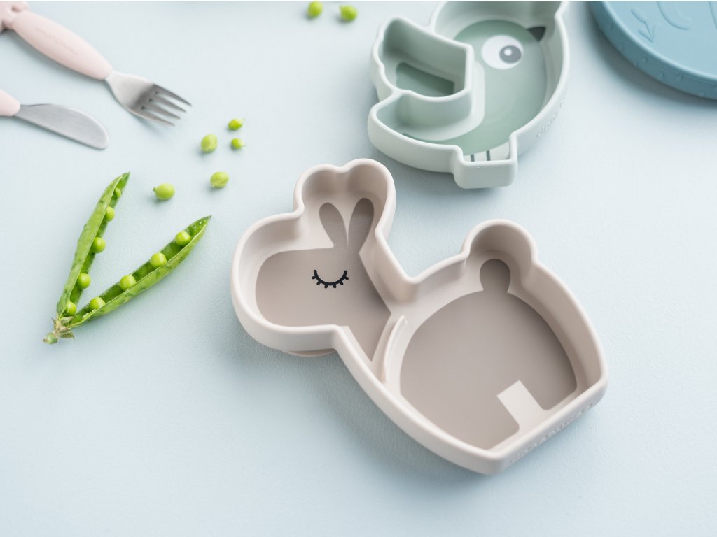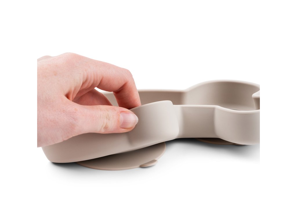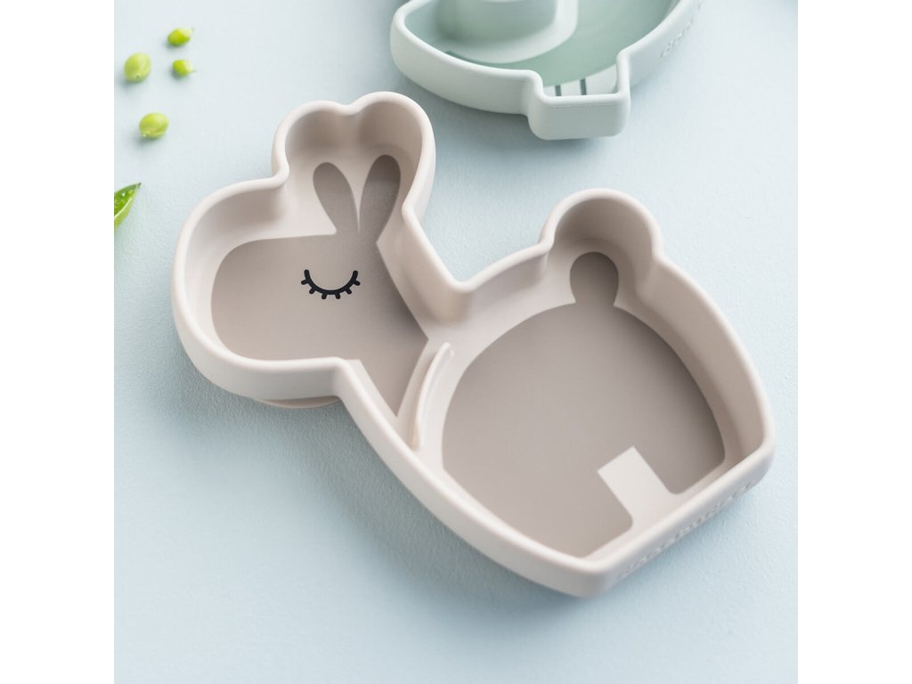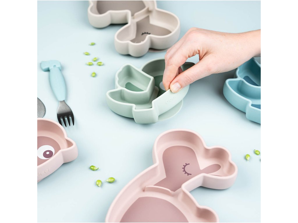 Přísavná základna zabraňuje malým dětem tlačit, překlápět nebo házet talíř. Dvě přihrádky pro oddělení potravin. Dvě snadno odnímatelné chlopně jsou skryté pod ocasem a uchem Lalee. Zaoblené vnitřní okraje usnadňují malým dětem nabírání jídla. Tepelně odolný a vhodný pro použití v mikrovlnné troubě, troubě a mrazničce. 100% potravinářský silikon bez obsahu BPA je bezpečný pro děti. Roztomilý talíř na svačinu Lalee.
