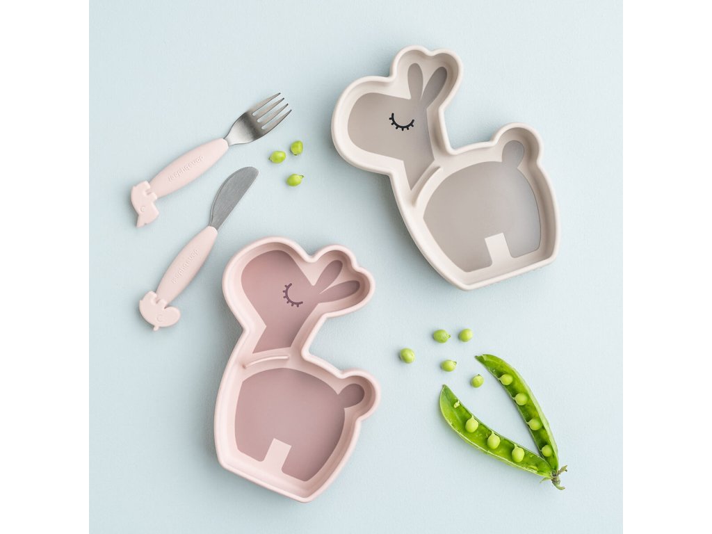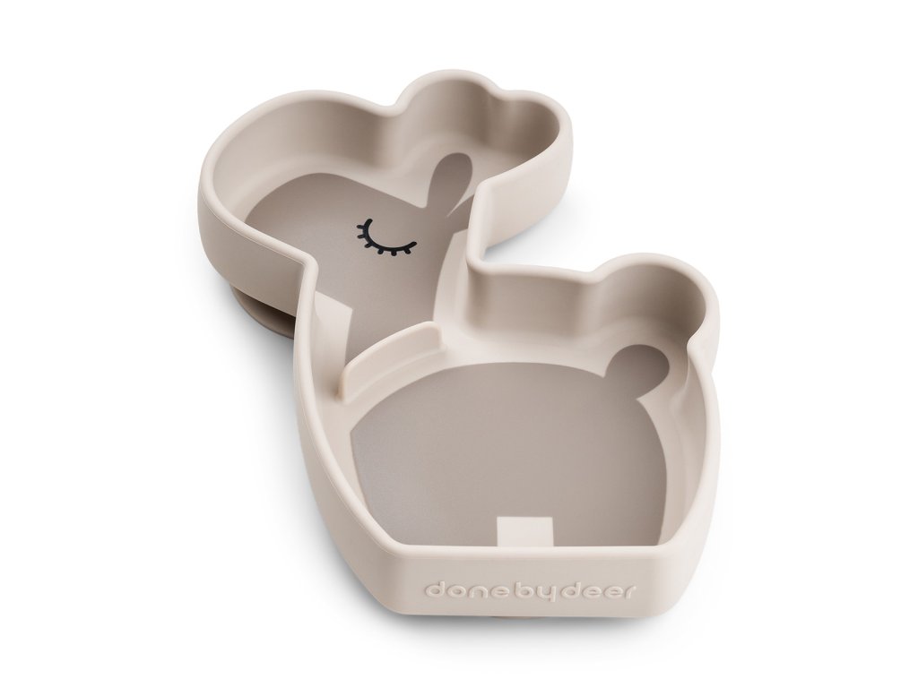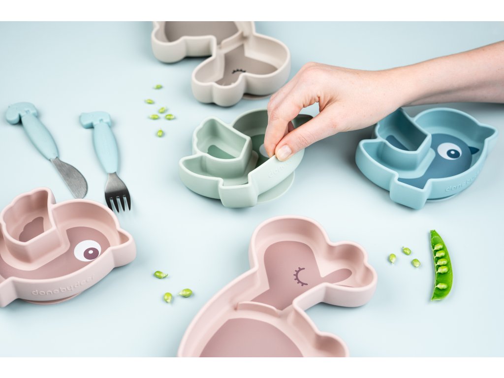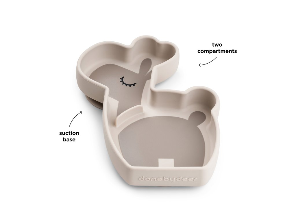 Přísavná základna zabraňuje malým dětem tlačit, překlápět nebo házet talíř. Dvě přihrádky pro oddělení potravin. Dvě snadno odnímatelné chlopně jsou skryté pod ocasem a uchem Lalee. Zaoblené vnitřní okraje usnadňují malým dětem nabírání jídla. Tepelně odolný a vhodný pro použití v mikrovlnné troubě, troubě a mrazničce. 100% potravinářský silikon bez obsahu BPA je bezpečný pro děti. Roztomilý talíř na svačinu Lalee.
