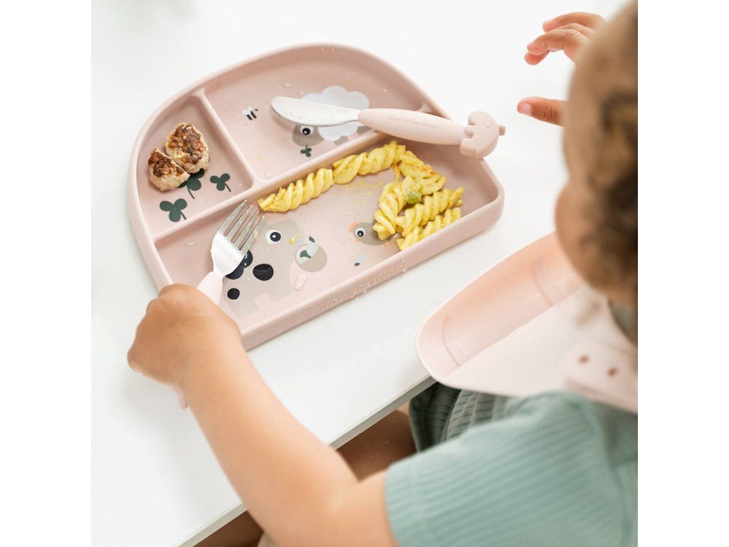 Jídelní talířek s hezkými obrázky. Přísavky na talíři udrží nádobí na místě během jídla. 100% potravinářský silikon bez obsahu BPA je bezpečný pro děti. Nádobí v jemných pudrových odstínech s vyraženými detaily roztomilých Deer friends. Perfektní dárek pro malé jedlíky.